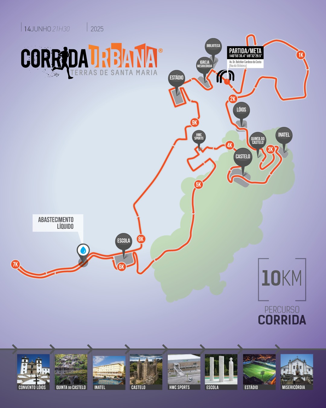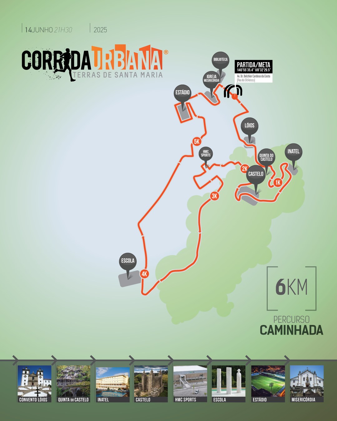 A 𝗖𝗼𝗿𝗿𝗶𝗱𝗮 𝗨𝗿𝗯𝗮𝗻𝗮® é um trail urbano noturno que alia o desporto ao ar livre com uma forte vertente cultural. Durante a Corrida e a Caminhada, os participantes poderão apreciar a imponência do Castelo, a serenidade da Igreja da Misericórdia, a energia do Estádio Marcolino Castro, a vivacidade da Escola EB 2, 3 Fernando Pessoa, a história da Igreja Matriz, a tranquilidade do Claustro do Convento dos Lóios, a beleza natural da Quinta do Castelo, a mística das Grutas.